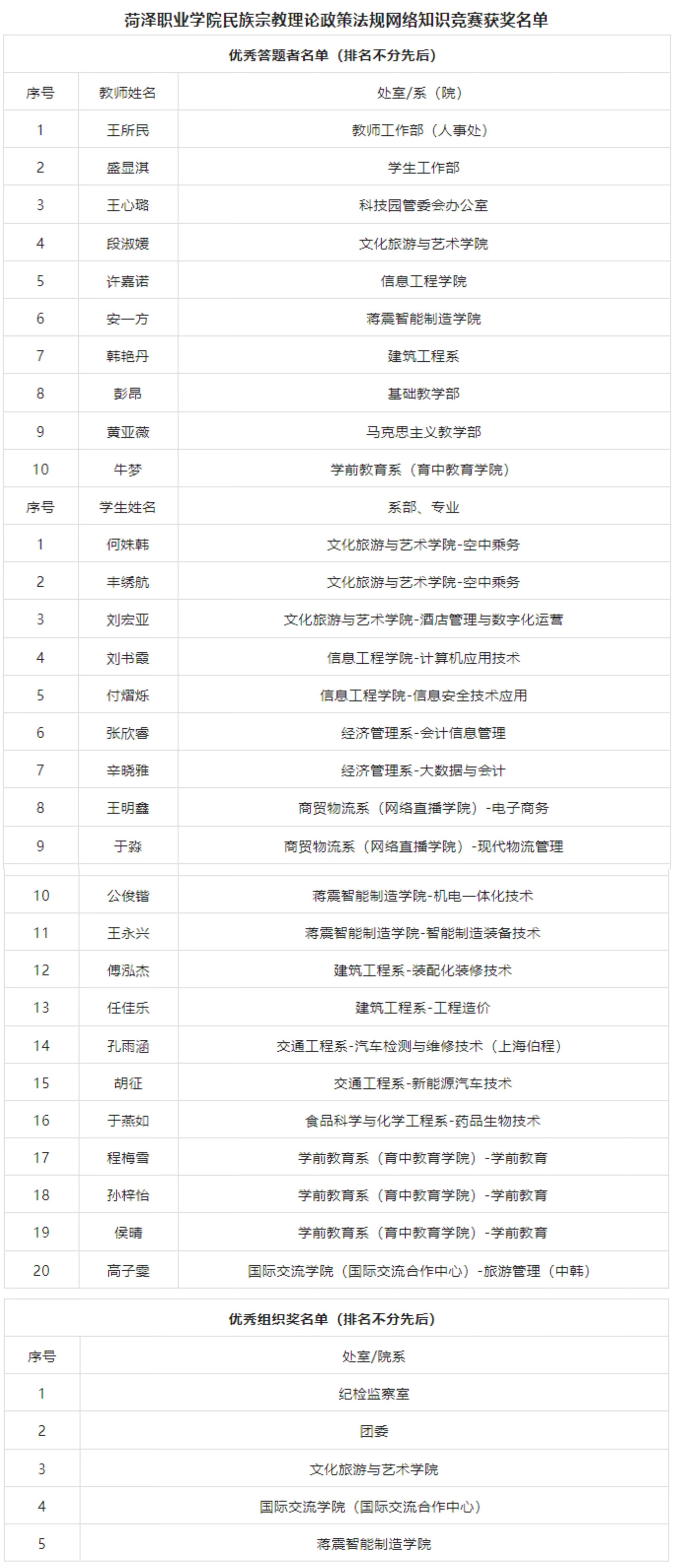竞赛知识覆盖了习近平总书记关于加强和改进民族工作的重要思想、关于宗教工作的重要论述,中国特色社会主义民族宗教理论、党的民族宗教政策和国家有关法律法规等应知应会内容。根据竞赛规则,综合考量各部门的师生参与率、平均答题分数、组织动员成效等标准,最终评选出5个“优秀组织奖”部门,分别为纪检监察室、团委、文化旅游与艺术学院、国际交流学院(国际交流合作中心)、蒋震智能制造学院。同时,为进一步激励竞赛中表现突出的教师与学生,依据答题分数、答题完成质量等综合指标,共评选30名“优秀答题者”予以表扬。