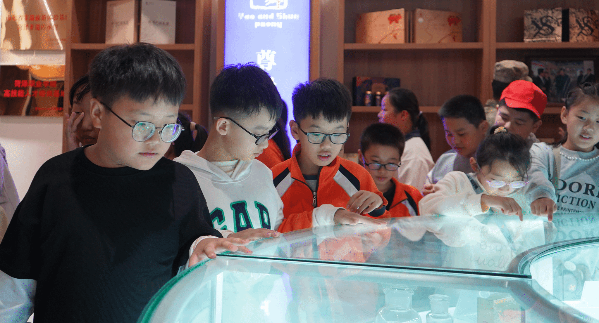 在牡丹产品展销区,柜中展示的牡丹精品吸引着孩子们驻足观看。“在一代代菏泽牡丹人和无数劳动人民的不懈努力下,目前菏泽已成为了全国最大的牡丹培育、生产、科研、观赏以及出口的基地”,讲解员介绍道。