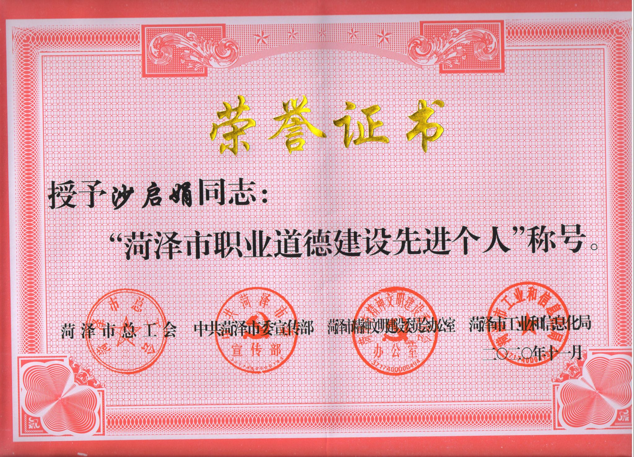沙启娟同志荣获“菏泽市职业道德先进个人”称号