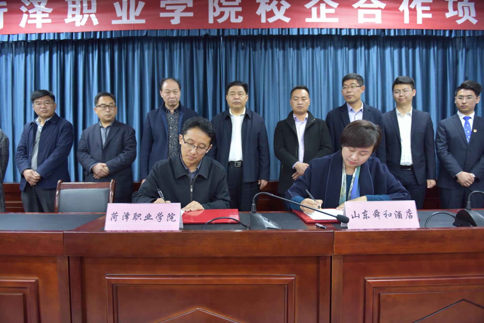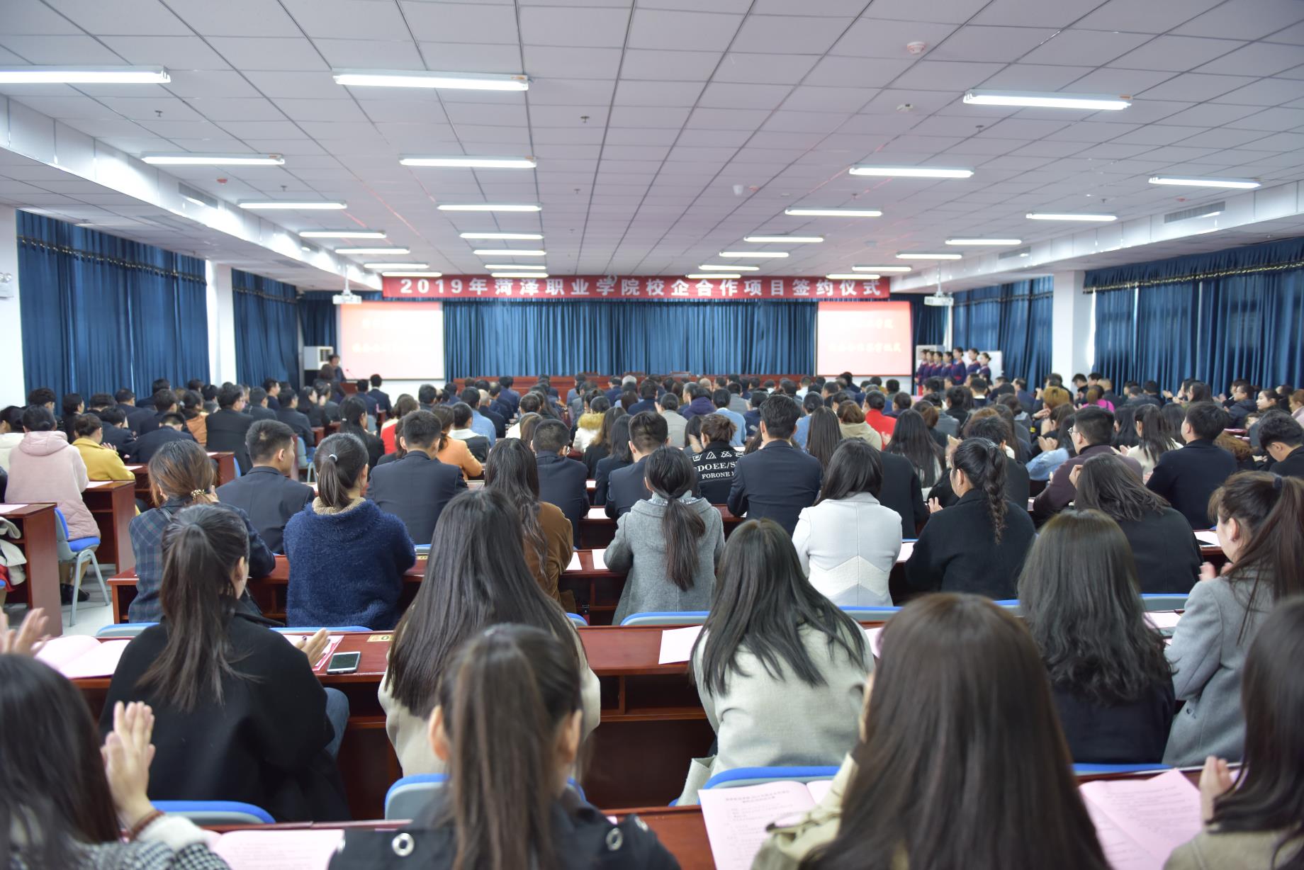 awc777万象城娱乐官网副院长王朝景、副院长陈俊启、纪委书记张献忠、党委委员胡宪奎,十二家合作公司负责人出席签约仪式,学院党委副书记周福举主持仪式。学院副科级以上干部,系部管理岗人员,学生代表三百余人参与仪式。