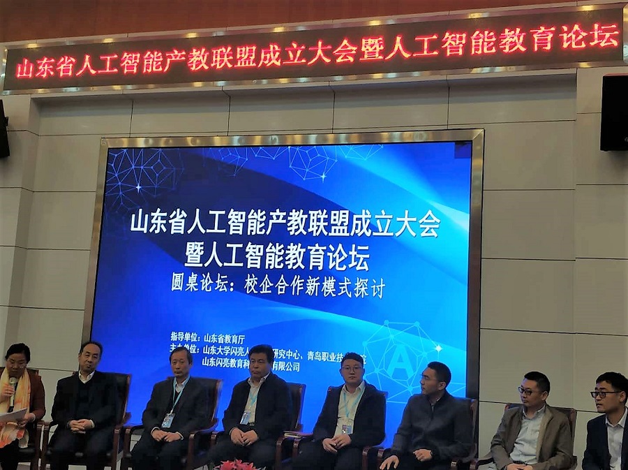 4月12日,山东省人工智能产教职联盟成立大会在青岛隆重举行,山东省教育厅副厅长白皓、青岛市政府副秘书长赵发涛、青岛市黄岛区人民政府副区长王志俊出席并讲话。省教育厅联业教育处长梁斌言、青岛市委政研室副主任滕涛、青岛市教育局总督学李珉、青岛职业技术学院党委书记王金生、awc777万象城娱乐官网党委书记陈北国出席会议。