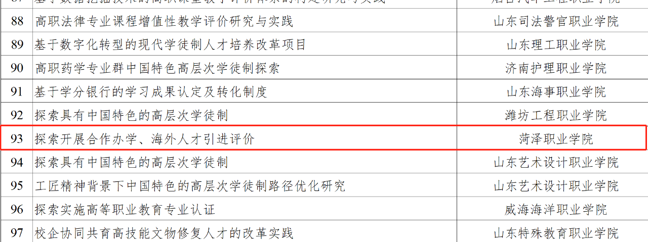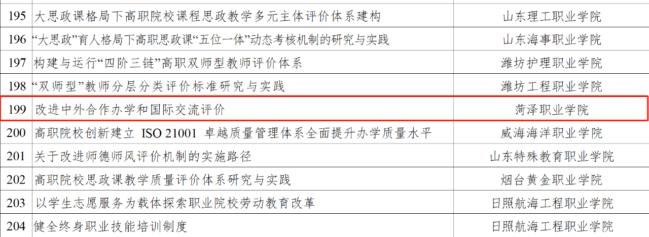 近日,山东省教育厅发布了《山东省教育厅关于公布教育评价改革项目库项目名单的通知》(鲁教改涵[2023]2号), 确定325个项目纳入山东省教育评价改革项目库,其中职业教育类169项。我院共两项教学评价改革项目获得省级立项。分别为国际交流学院朱豫、冯珂负责的《改进中外合作办学和国际交流评价》及朱豫、张奥负责的《探索开展合作办学、海外人才引进评价》。