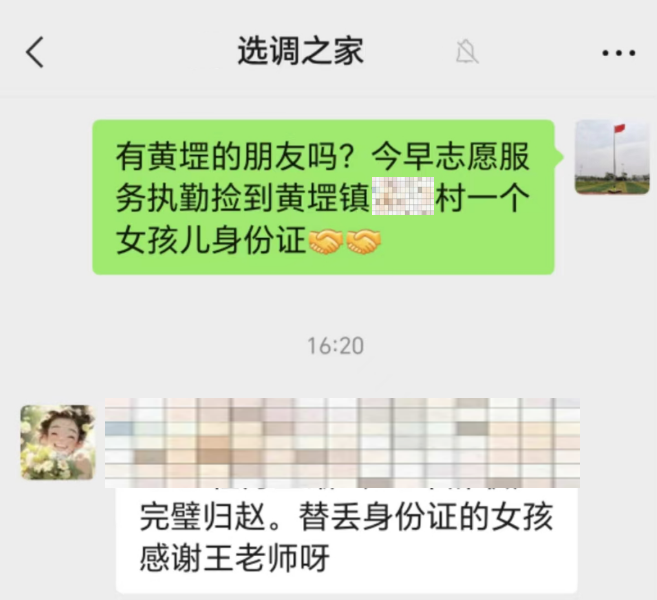 曾经有过政府工作经历的王晰老师多方联系,并在多个交流群发信息,最后在“选调之家”寻找到失主的信息,通过接力与黄堽镇有关同志取得了联系,并于一个多小时后成功联系到了丢失证件、急于办事的失主,送还了身份证。失主为感谢志愿者王晰,特别买了两兜水果表示感谢,王晰老师说我们是志愿者,也是党员,都是应该做的,说什么也不收。