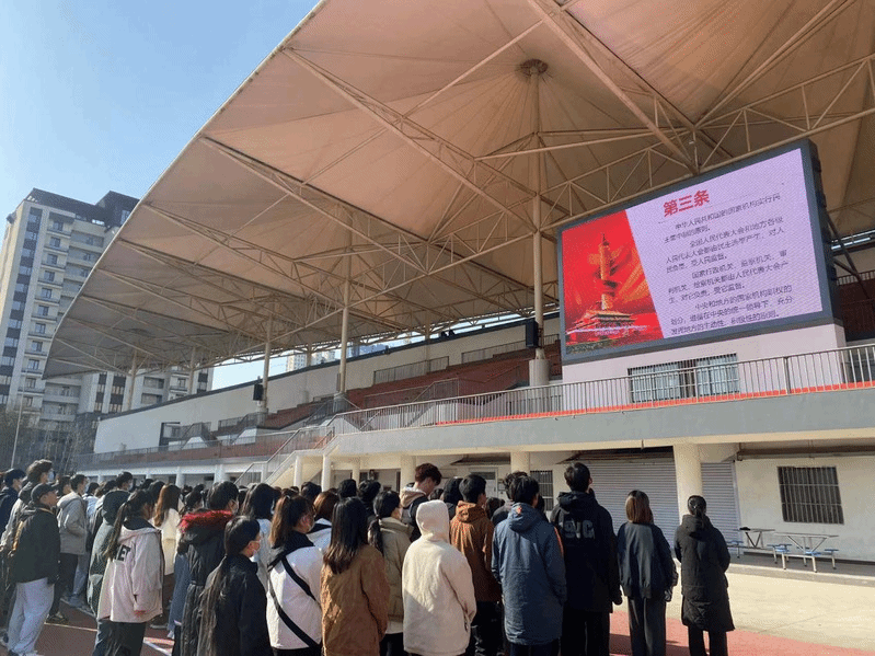 一是在体育场组织规模较大的诵读活动。感悟法治氛围,体会宪法精神。