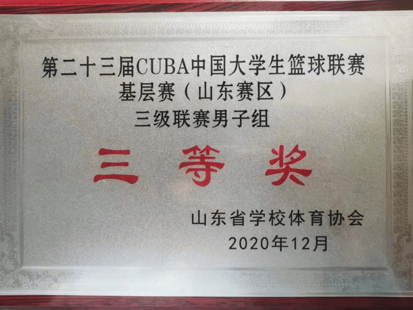 2020年12月23日至12月30日,由山东省学校体育协会主办、山东外事职业大学协办的第23届CUBA中国大学生篮球三级联赛(山东赛区)男子比赛在山东外事职业大学体育馆举行,吸引了来自省内30所高校40支队伍,共计600余人参赛。awc777万象城娱乐官网男篮在领队边峰老师、教练员秦传斌老师的带领下,荣获三等奖!