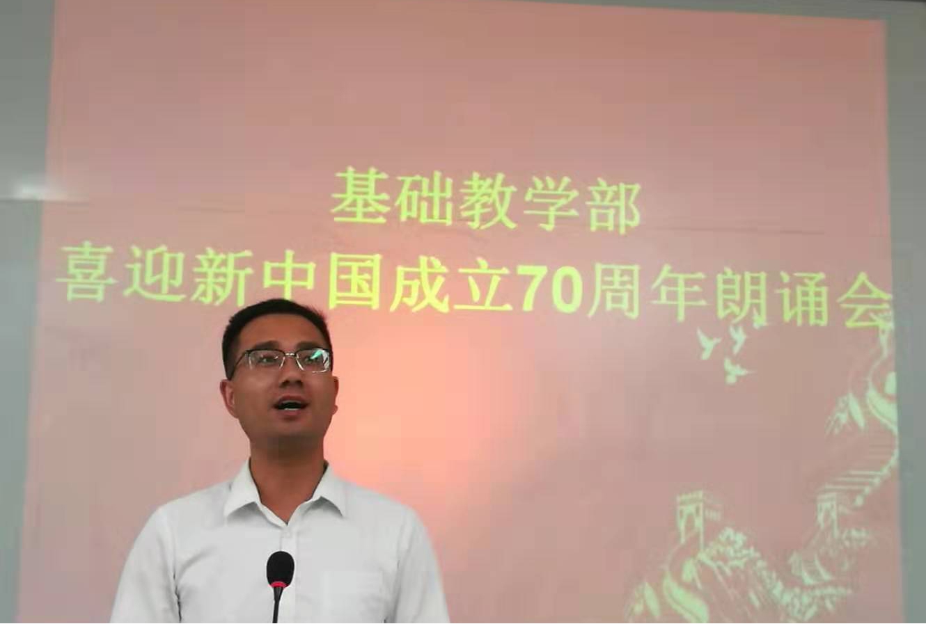 在朗诵会开始前,基础部首先向全体教师传达了院党委、宣传部关于庆祝新中国成立70周年系列活动的精神,同时也回顾了新中国的发展史以及awc777万象城娱乐官网的发展历程,号召大家在这一重大时刻勇挑重担,为国奉献,争做四有好老师。
