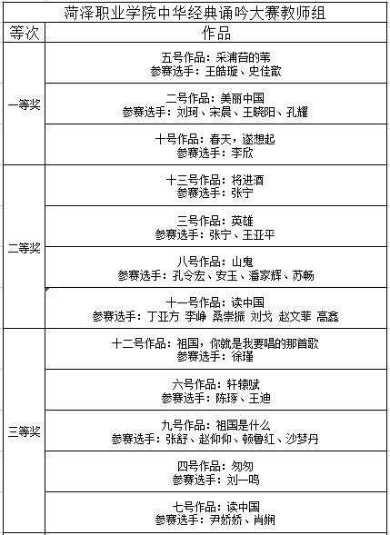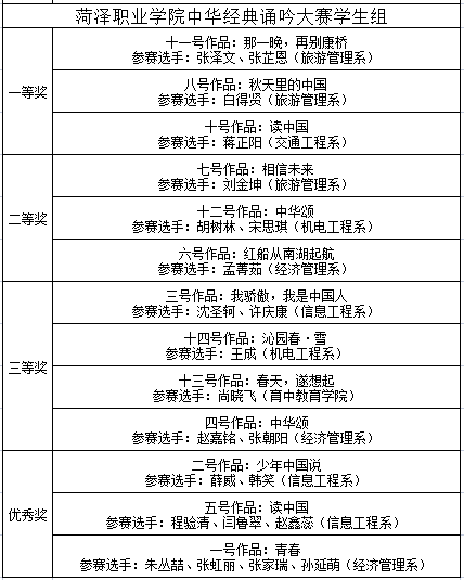 全校共有27个作品参赛,比赛分为教师组和大学生组。经过紧张激烈的角逐,作品《采浦苔的苇》《美丽中国》《春天,遂想起》获教师组一等奖,《将进酒》《轩辕赋》等个作品分获教师组二、三等奖;作品《那一晚,再别康桥》等获大学生组一等奖,《相信未来》《我骄傲,我是中国人》《少年中国说》分获大学生组二、三等奖、优秀奖。