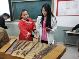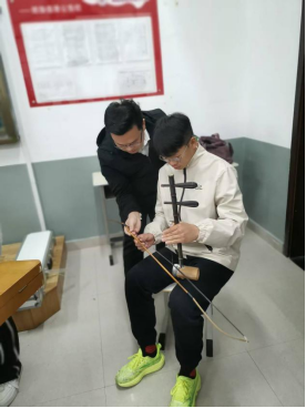 李老师一行手把手指导学生体验山东琴书伴奏乐器,让大家近距离触摸非遗技艺。