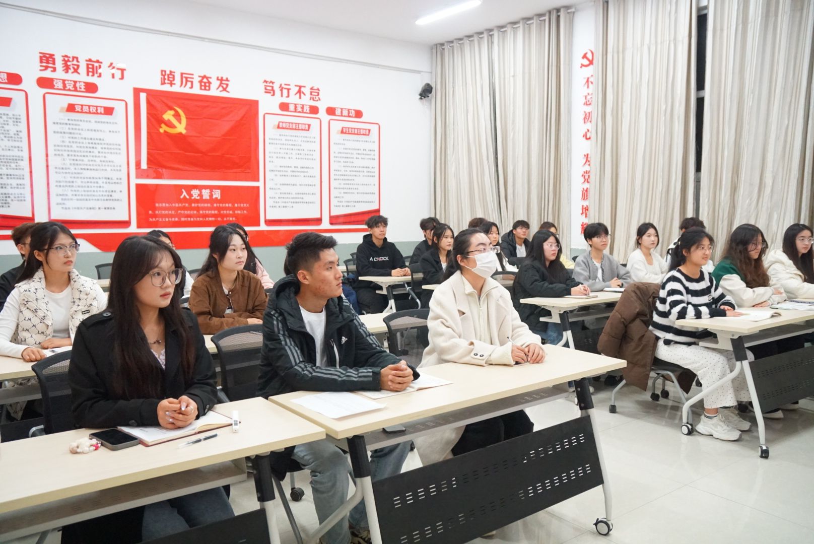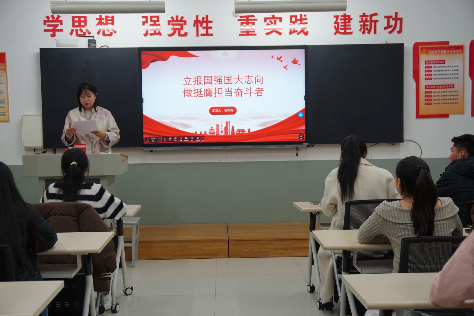 活动伊始,学生党支部书记徐阳昭通过视频与案例,深入解析了报国强国的时代内涵与“挺膺担当”的精神实质。现场设置了“强国使命我来答”互动环节,学生们踊跃参与,深化认知;在“我的奋斗担当”分享环节,同学们积极发言,畅谈在专业学习与志愿服务中践行使命的规划。