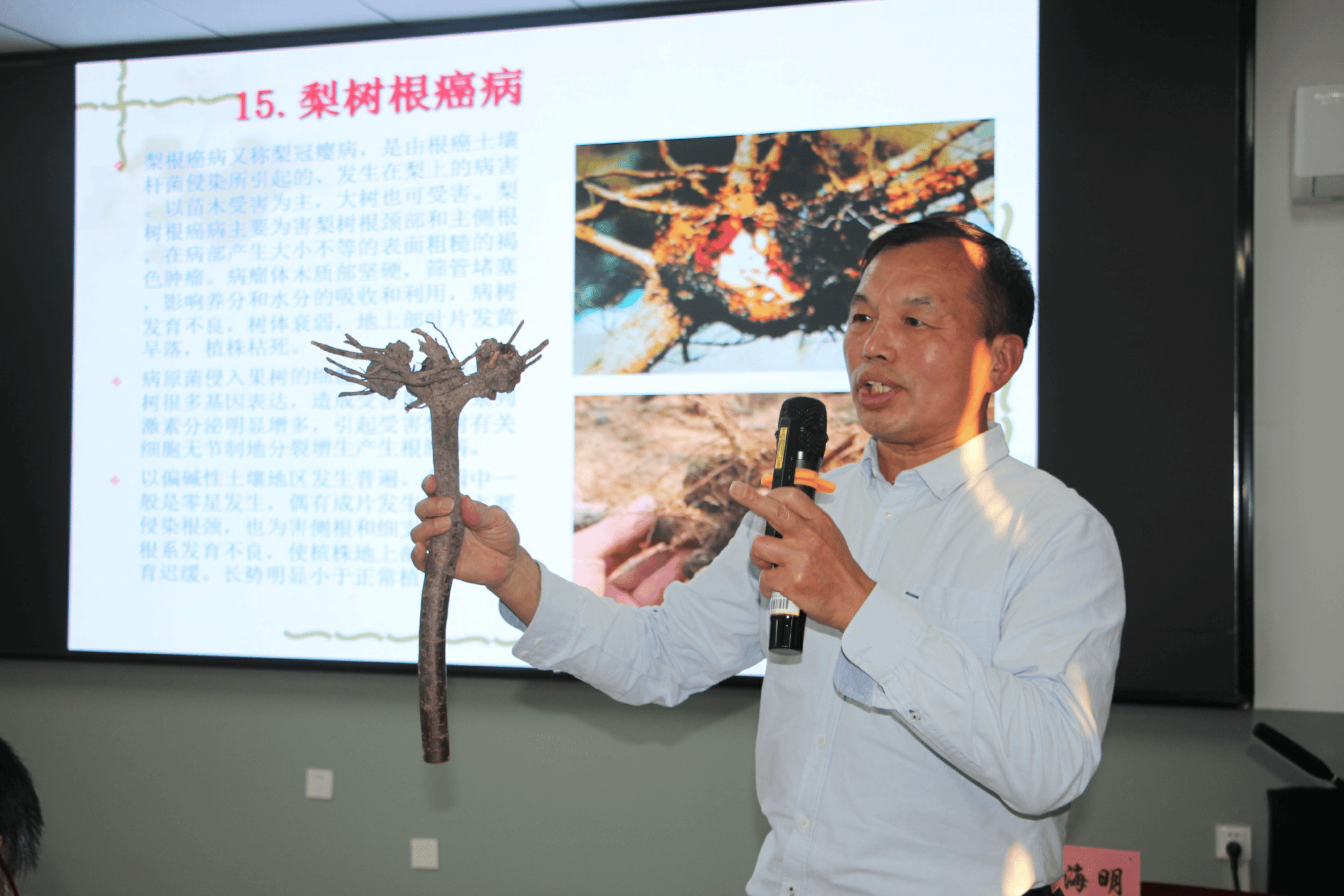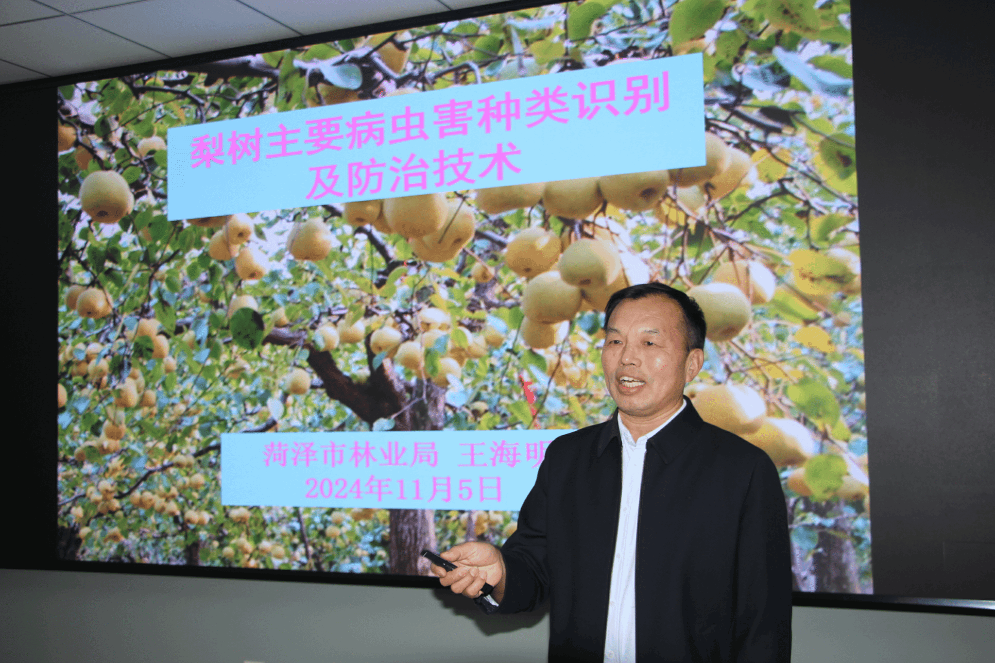 开班仪式结束后,菏泽市林业局首席专家、二级研究员王海明受邀以“梨树主要病虫害种类识别及防治技术”为主题,对39种梨树病虫害的识别特征、发生规律、防治措施等进行了详细讲解,为参加培训的学员上了生动的“开班第一课”。王海明强调,梨树病虫害种类繁多,发生规律复杂,给防治带来较大困难,及时发现、准确诊断、彻底弄清病虫种类,进行科学防治是确保梨正常发挥效益的重要保证。
