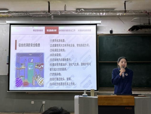 张艳用生动形象、通俗易懂的语言为师生讲解了在教室、宿舍、实验室如何避免火灾的发生及对突发情况的处理方法,并强调了火灾事故的突发性和破坏力。