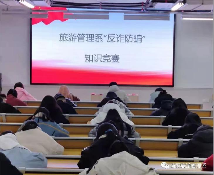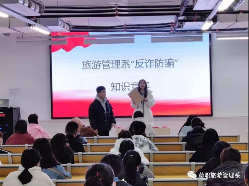 为进一步增强学生防范网络电信诈骗犯罪的意识、提高防范网络电信诈骗犯罪的能力,最大限度减少财产损失、保护财产安全,2021年12月9日旅游管理系于菏泽市职业教育园区2—3阶梯教室组织开展防诈骗知识竞赛。