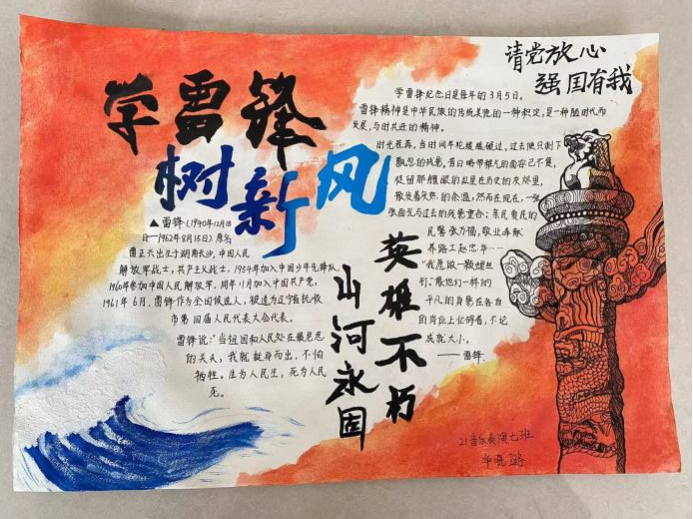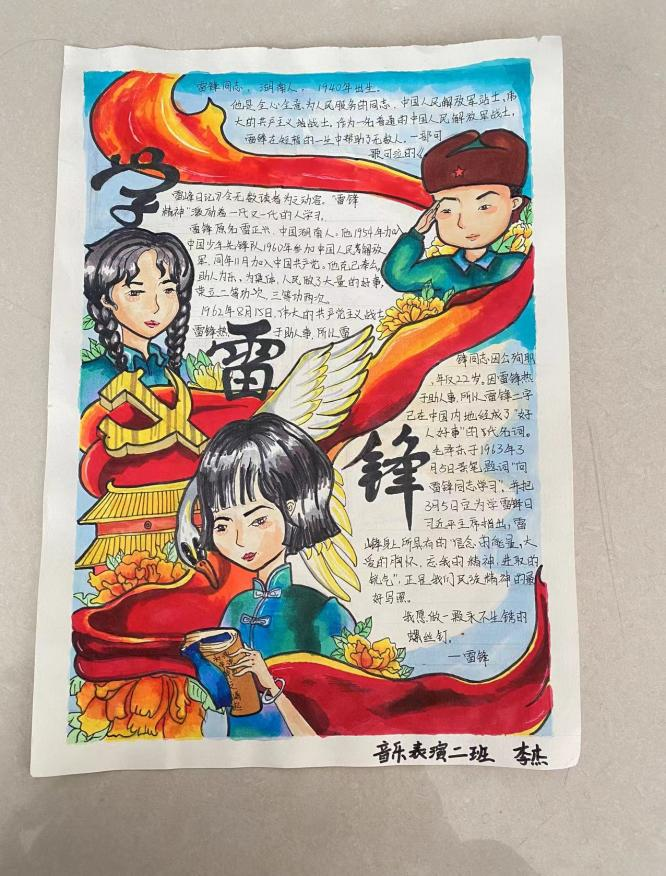 用色彩让雷锋精神历历在目,旅游管理系举行了“雷锋日”手抄报竞赛活动,各班积极参与。最终评选出了一等奖一名,二等奖三名,三等奖五名,并提出嘉奖。也为此次活动画上了圆满的句号。