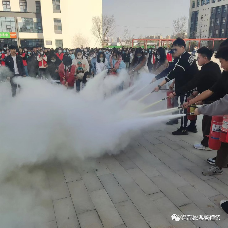 随后,由专业人员进行灭火器使用方法讲解及操作示范,同学们积极参与实战灭火,正确使用灭火器将大火扑灭。