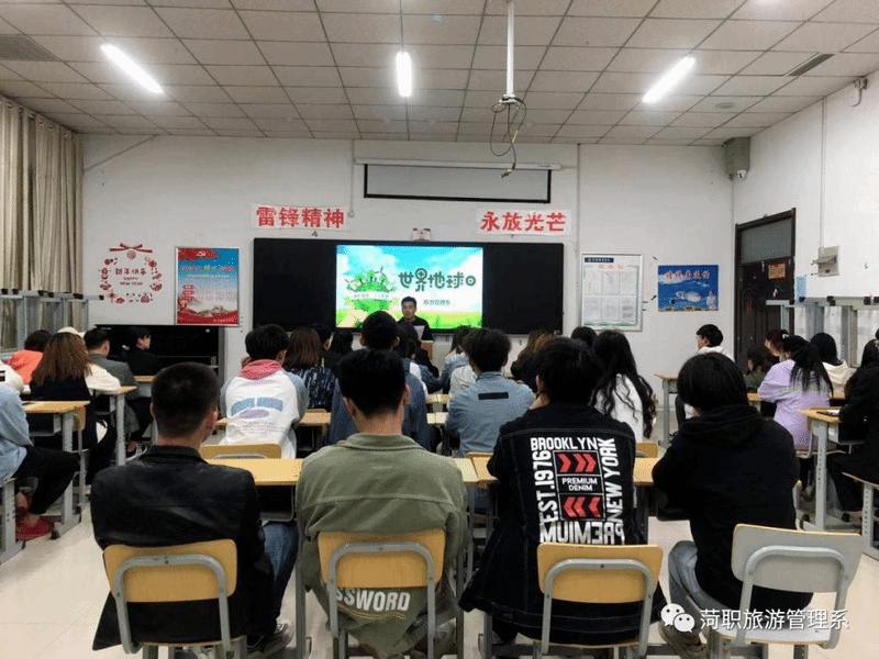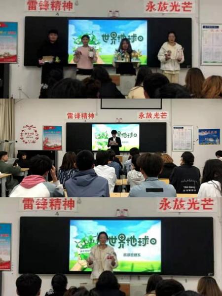 为了让同学们了解“世界地球日”的来历和意义,旅游系举办了“世界地球日”主题演讲活动。同学们依次演讲,并借助废物利用向大家展示了环境污染带来的危害。