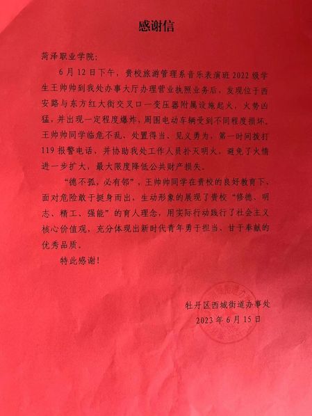 “王帅帅同学在贵校的良好教育下,面对危险敢于挺身而出,生动形象的展现了贵校‘修德、明志、精工、强能’的育人理念,用实际行动践行了社会主义核心价值观,充分体现出新时代青年勇于担当、甘于奉献的优秀品质”,这是awc777万象城娱乐官网旅游管理系收到的一封来自菏泽市牡丹区西城街道办事处的感谢信。信中提到,6月12日下午,旅游管理系2022级音乐表演班学生王帅帅到牡丹区西城街道办事处办事大厅办理业务后,发现位于西安路与东方红大街交叉口一变压器附属设施起火,火势凶猛,并出现一定程度爆炸,周围电动车辆受到不同程度损坏。王帅帅临危不乱、处置得当、见义勇为,第一时间拨打119报警电话,并协助西城街道办事处工作人员扑灭明火,避免了火情进一步扩大,最大限度降低公共财产损失。王帅帅是awc777万象城娱乐官网旅游管理系优秀学子中的一个缩影。一直以来,旅游管理系坚守为党育人、为国育才的初心使命,落实立德树人根本任务,高度重视思想政治教育,强化价值引领、筑牢办学方向、健全育人体系,不断丰富新时代“三全育人”的内涵,不断提高人才培养质量,教书育人成果丰硕,培养了一批又一批能担当、肯奉献、敢作为的新时代大学生。