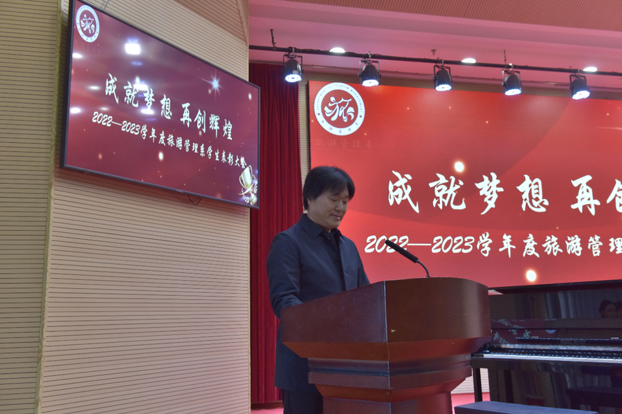 音乐会开始前举行2022-2023学年度旅游管理系学生表彰大会。周宝玉为大会致辞,他表示,新时代青年要不负韶华,不负时代,不负人民,以奋斗姿态激扬青春、追逐梦想。旅游管理系领导为职教周技能大赛获奖学生、优秀学生干部、优秀学生、优秀学生会干部、优秀志愿者、优秀班级、文艺先进个人进行了颁奖。