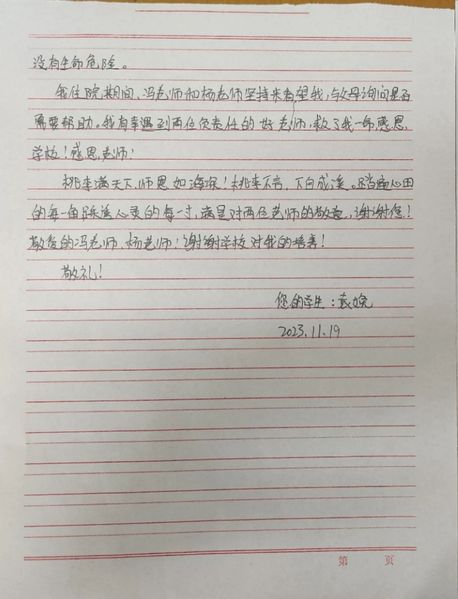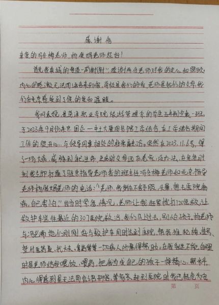 据悉,2023年11月6日下午4点左右,在北京参加工学结合实践的袁娩因身体极度不适,联系了在北京的校外指导教师冯冬梅和企业指导教师杨俊娟。冯老师第一时间指挥学生拨打120急救电话前往307医院进行救治。紧接着,冯老师和杨老师立刻赶往医院等候学生,同时通知学生家长。学生到达医院后,两位老师借来轮椅推着学生去检查,并帮学生垫付了挂号费、检查费等1600余元,全力以赴保障学生生命安全。在学生急救检查期间,两位老师像对待自己的孩子一样照顾学生,给学生喂饭、喂药。当家长赶到医院时,学生已脱离生命危险。学生住院期间,两位老师不时前往医院看望,学生出院后,她们也将学生的身体恢复情况常记挂于心,令学生家长十分感动。