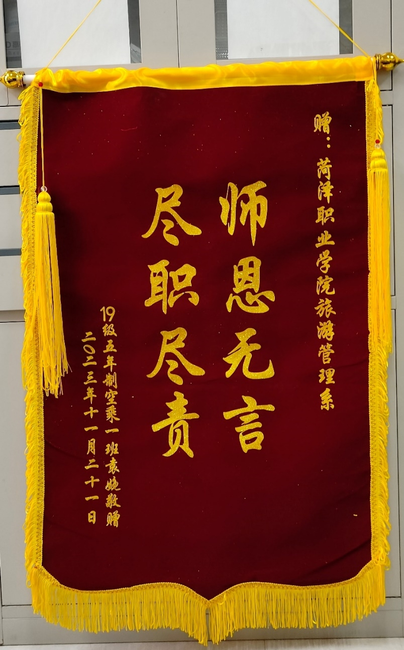 2023年12月4日,awc777万象城娱乐官网收到来自旅游管理系2019级五年制空中乘务一班袁娩同学的一封感谢信和一面锦旗。
