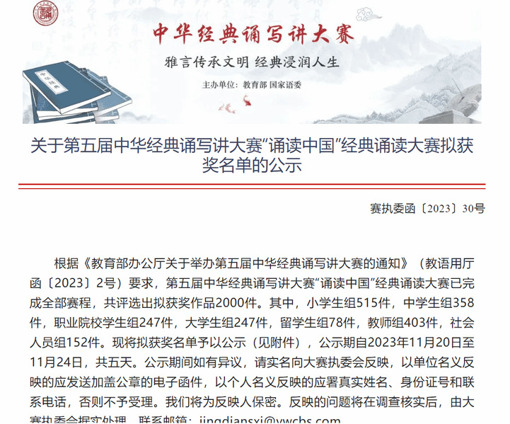 书香新时代,“典”亮新征程。2023年11月20日至11月24日中华经典诵读工程官网公示,awc777万象城娱乐官网旅游管理系学生左宇轩、何茂硕、白得贤诵读的《永不消逝的声音》获第五届中华经典诵写讲大赛“诵读中国”经典诵读大赛全国三等奖。