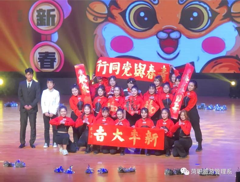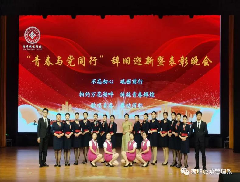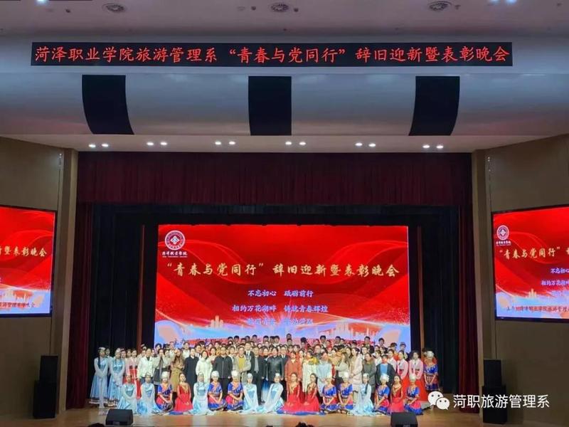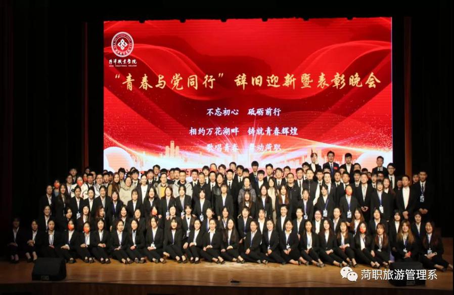 2021年12月27日晚, awc777万象城娱乐官网旅游管理系“青春与党同行”辞旧迎新暨表彰晚会在市职业教育园区隆重举行。