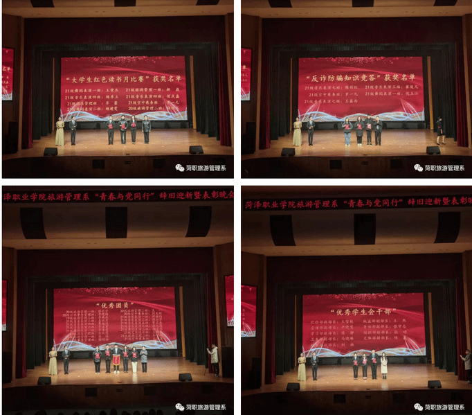 为表彰先进,旅游管理系领导对“大学生红色读书月比赛”、“反诈防骗知识竞赛”、“优秀班集体”、“文明宿舍”、“优秀班干部”、“优秀团员”、“优秀学生”、“优秀学生会干部”、“优秀学生会干事”、“禁烟小组”,进行颁奖并合影留念。