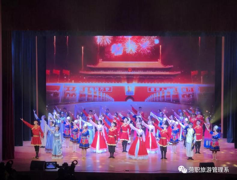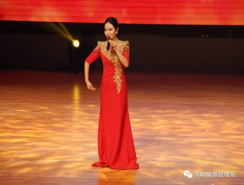 旅游管理系教师李欣演唱的歌曲《为祖国干杯》,长城举起团结的酒杯,彰显民族的自豪;黄河举起热情的酒杯,泼洒中华的赤诚。中华儿女们心连心手牵手,为走向伟大复兴的祖国干杯!