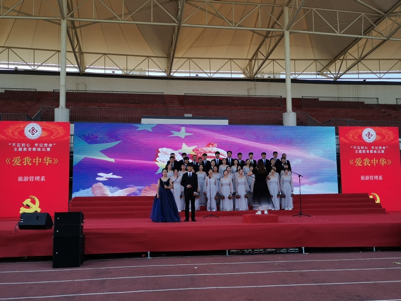 旅游管理系参赛的歌曲是《爱我中华》、《复兴的力量》。合唱团成员身着统一服装,以挺拔向上的姿态立于舞台之上,英姿勃发。随着细腻而深具民族风味的音乐响起,参赛同学皆振奋精神,以最好的姿态迎接比赛,充满着深情的歌声响彻舞台。我系合唱团的同学们用优美的歌声与韵味十足的舞蹈表演相合,使歌曲所呈现的情感更具张力。“五十六个星座五十六只花,五十六族兄弟姐妹是一家。正如歌中所唱,这正是我们伟大祖国的真实写照,是我们中华民族自强不息精神的真实写照。