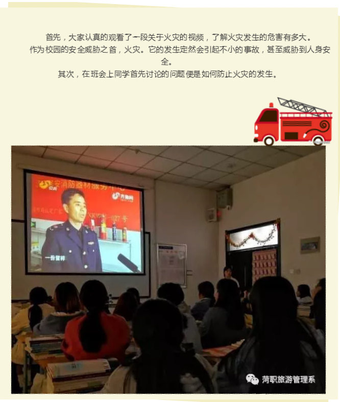 我系为响应学院号召于三月二十日下午各班利用班会时间观看《齐鲁消防》节选 ,对学生进行安全教育。宋主任及各班班主任针对加强学生安全教育问题进行开会研究。 此次的安全教育讲座,在宋主任的带领下让同学们知道了作为大学生该如何正确的防范这些事故的发生,减少不必要的损失;这是大学生共同的责任和义务。