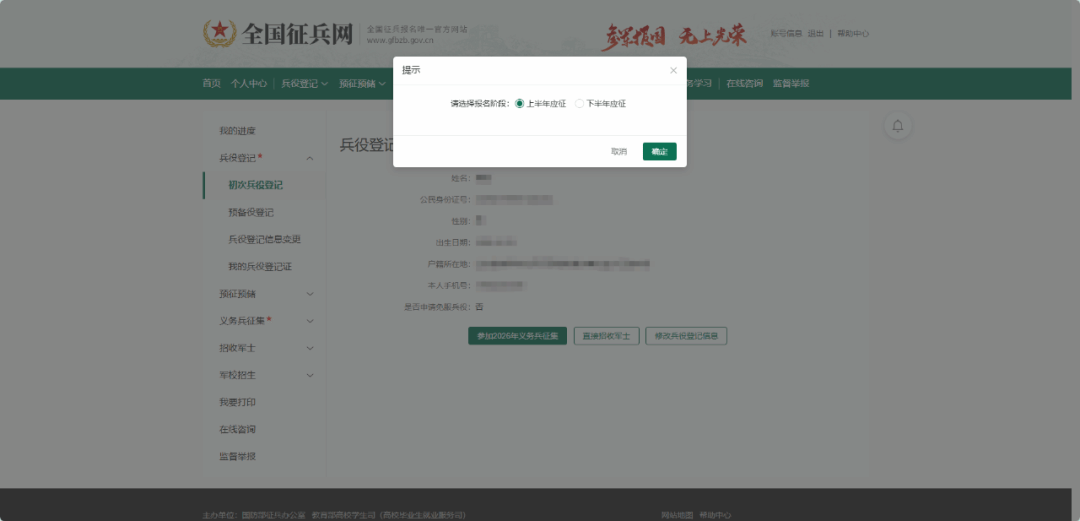 点击“参加2026年义务兵征集”会出现选择上半年应征或下半年应征。