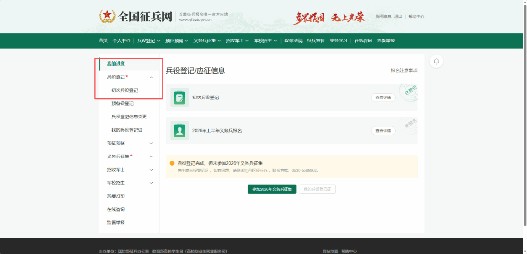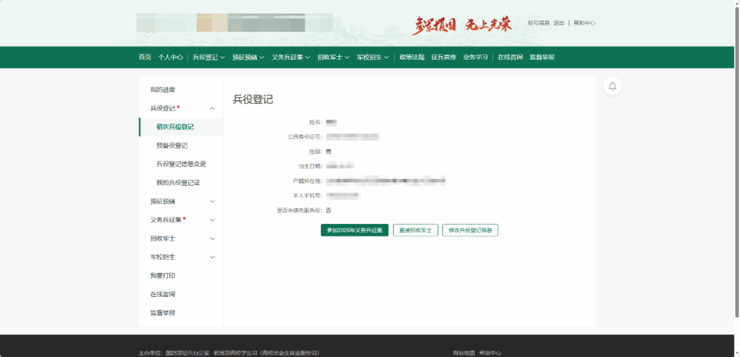 如果已经完成兵役登记,登入系统后就会跳转至以下界面,应征青年只需要点击“参加2026年义务兵征集”完善个人信息即可。