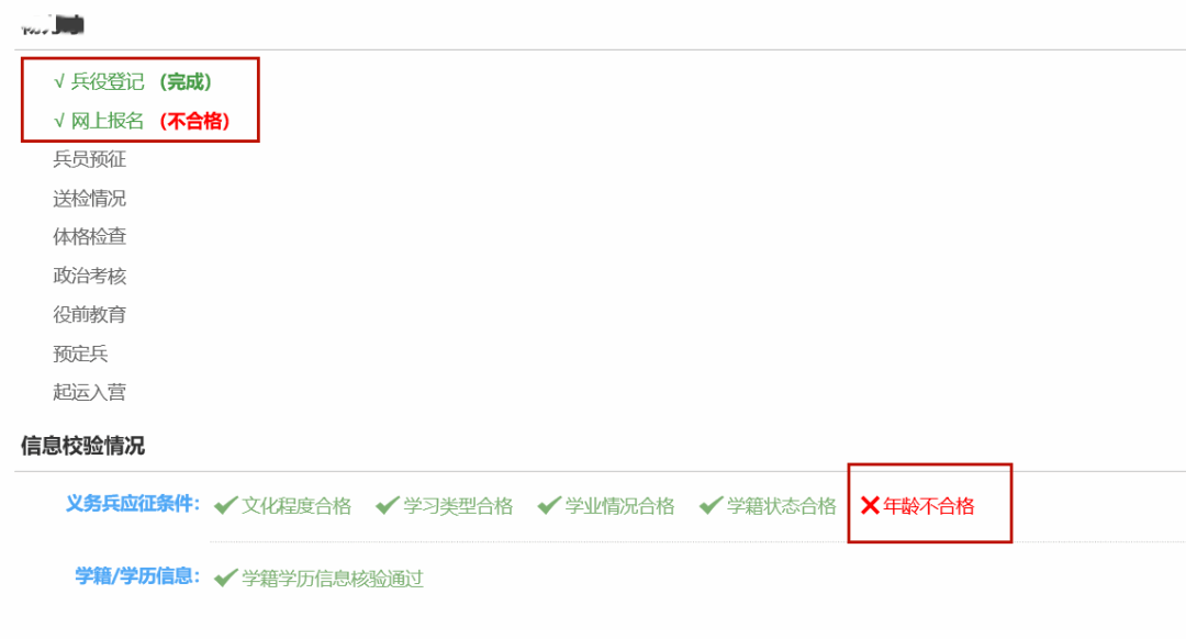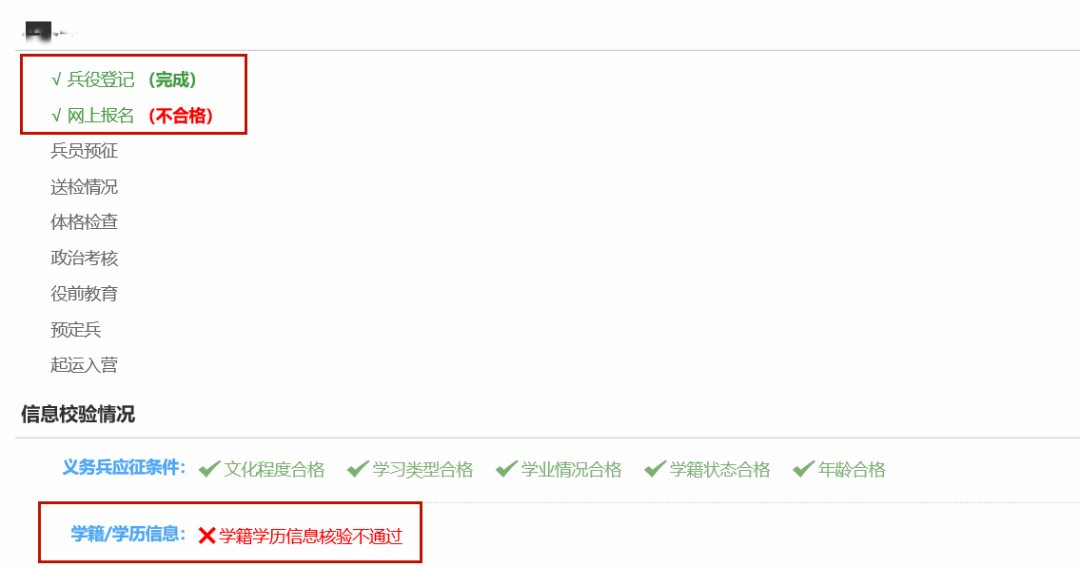 登录全国征兵网,可直接查看报名是否完成。一般可分为:“完成”、“不合格”和“应征信息校验中”等情况,如下图所示: