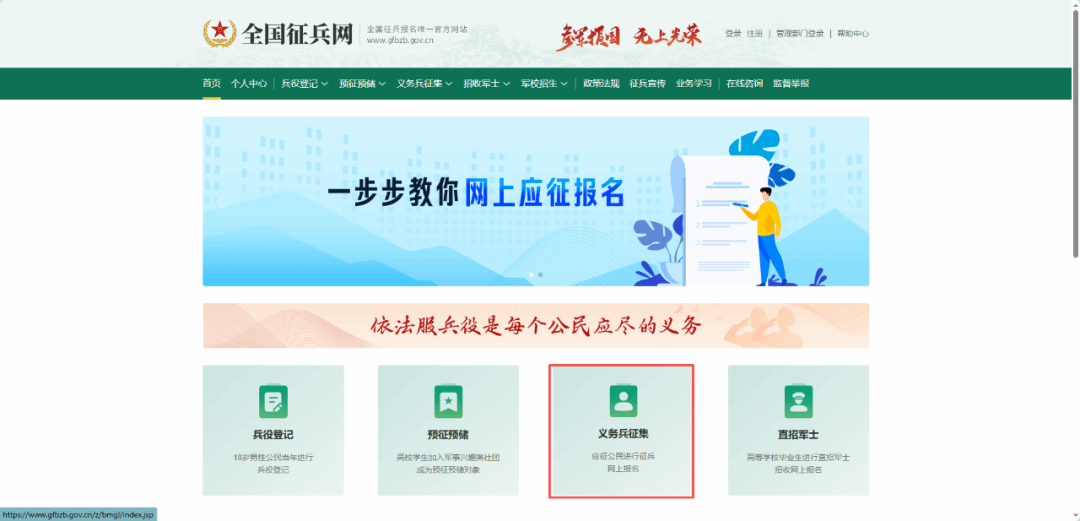 电脑登录全国征兵网 (www.gfbzb.gov.cn/),会出现以下界面,点击首页的“义务兵征集”进行跳转;