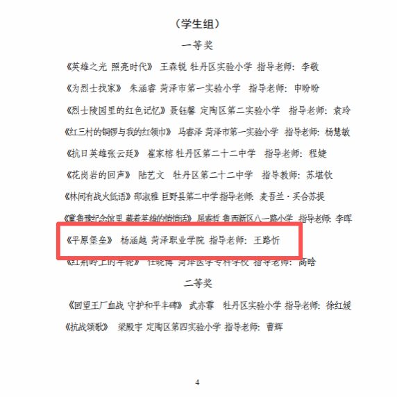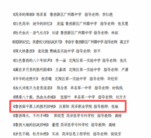 本次大赛面向全市大中小学师生,共征集学生稿件387篇、教师稿件126篇。经专家评审,万象城官网王新新老师凭借作品《油印机与红荆条》荣获教师组一等奖,杨涵越同学的作品《平原堡垒》、吕紫阳同学的作品《鲁西南平原上的胜利回响》分别荣获学生组一等奖、三等奖。