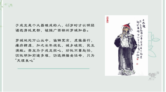 于成龙,字北溟,清朝山西永宁州人,历任罗城知县、合州知州、黄州知府、兵部尚书、两江总督等职。在朝为官,他经六省七地,清正廉明,行事谨慎,政务勤勉,治绩蜚声朝野;治家律己,他凝练了“勤、俭、学、善、廉”的家风,其子孙也多以“仁存正德、乐善公益、博施济众”而闻名乡里,受人称颂。