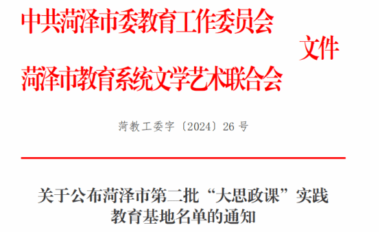 为深入贯彻落实习近平总书记关于“大思政课”的重要指示批示精神,加快构建全市“大思政课”工作格局,根据中共菏泽市委教育工作委员会、菏泽市教育系统文学艺术联合会联合印发的《关于开展第二批菏泽市“大思政课”实践教育基地申报工作的通知》(菏教工委字〔2024〕8号)精神,经各单位申报、县区推荐,经实地调研、综合评定程序,确定awc777万象城娱乐官网“青春·清菏韵泽”廉洁文化馆等29个场馆,为菏泽市第二批“大思政课”实践教育基地。