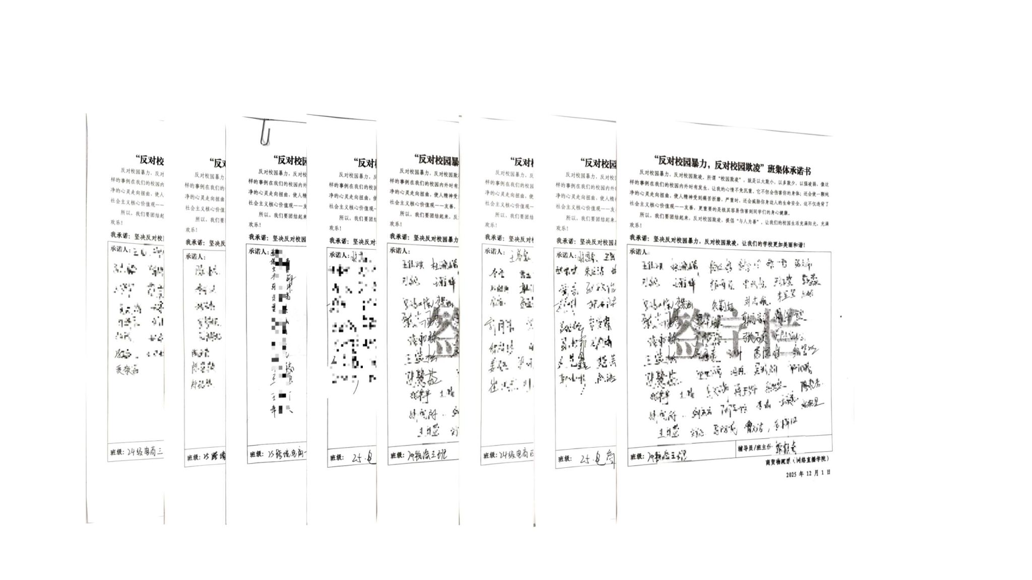 在各班班委的组织下,同学们郑重地在承诺书上签下自己的名字。这份承诺不仅是一纸签名,更是一份沉甸甸的责任与约定。它象征着班级成员对彼此安全与尊严的守护,表达了坚决抵制一切形式欺凌的集体立场,以及共同建设温暖、包容、互助的班集体的坚定决心。