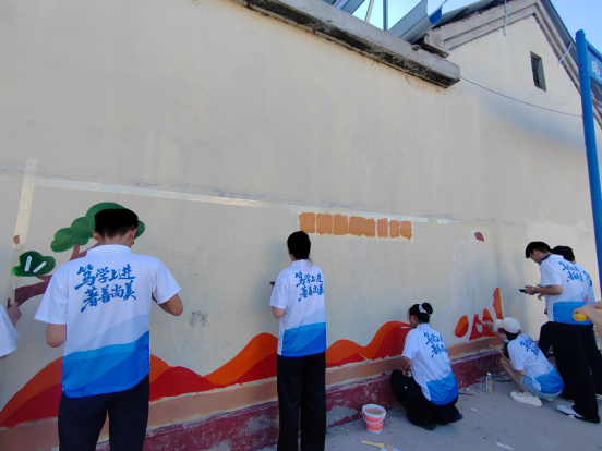 建筑工程系“匠心筑梦,执笔绘乡”团队以画笔为媒,在牡丹区何楼街道郭湾社区开展墙体彩绘活动。前期调研中,学生们结合社区特色与居民需求,设计“尊老爱老”主题墙绘方案。顶着高温,他们分工协作,勾勒出孝亲敬老、乡村风景等生动画面,并邀请社区小朋友共同创作,增强居民的参与感。墙绘不仅美化了乡村环境,更传递了传统文化内涵,成为乡村精神文明建设的亮丽名片。