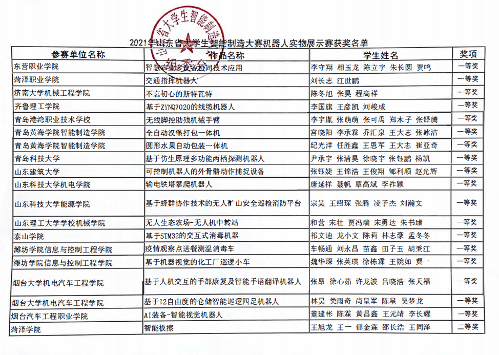 2021年山东省科技节暨山东省大学生智能制造大赛于9月25日成功落下帷幕。经过激烈角逐,awc777万象城娱乐官网交通工程系刘长志和江世鹏同学的作品在机器人实物展示赛项中斩获一等奖。