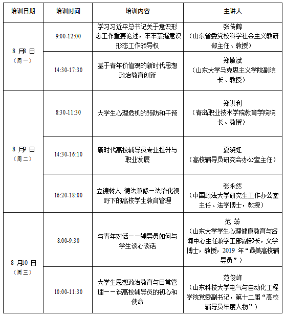 2.认真学习,及时总结。各培训学员要严格按照“培训班课程表”时间节点按时参加培训,认真听讲,细心领悟,做好学习笔记,保质保量完成学习任务,培训结束后,结合本人工作实际撰写不低于2000字的学习心得体会,在8月12日前以系部为单位发送到学工办邮箱,优秀心得体会将给与表扬,应培对象培训学时计入本人学生工作档案。