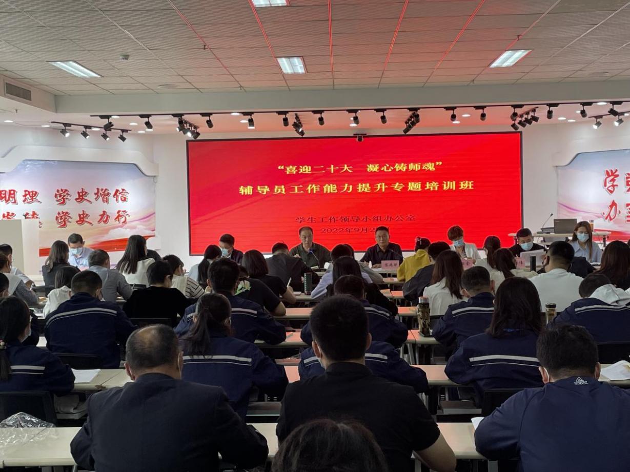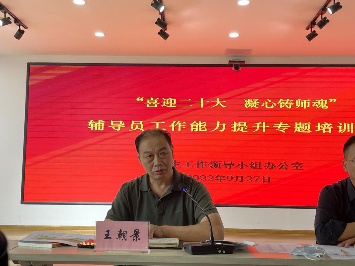为进一步加强和改进我院学生教育管理质量和服务水平,准确把握高校思想政治工作的新形势和新要求,努力建设一支高素质、专业化、职业化的辅导员队伍,推动我院思想政治工作的创新发展形成全员育人格局,9月27日,学生工作领导小组办公室在创业园903举办"喜迎二十大,凝心铸师魂"辅导员工作能力提升专题培训班,党委委员、副院长王朝景参加培训开班仪式并讲话,2016年以来招聘及2022年新入职的辅导员、学生工作办公室全体人员及全体宿舍管理员八十余人参加本次培训。开班仪式由学院学生工作领导小组办公室主任陈兆刚主持。