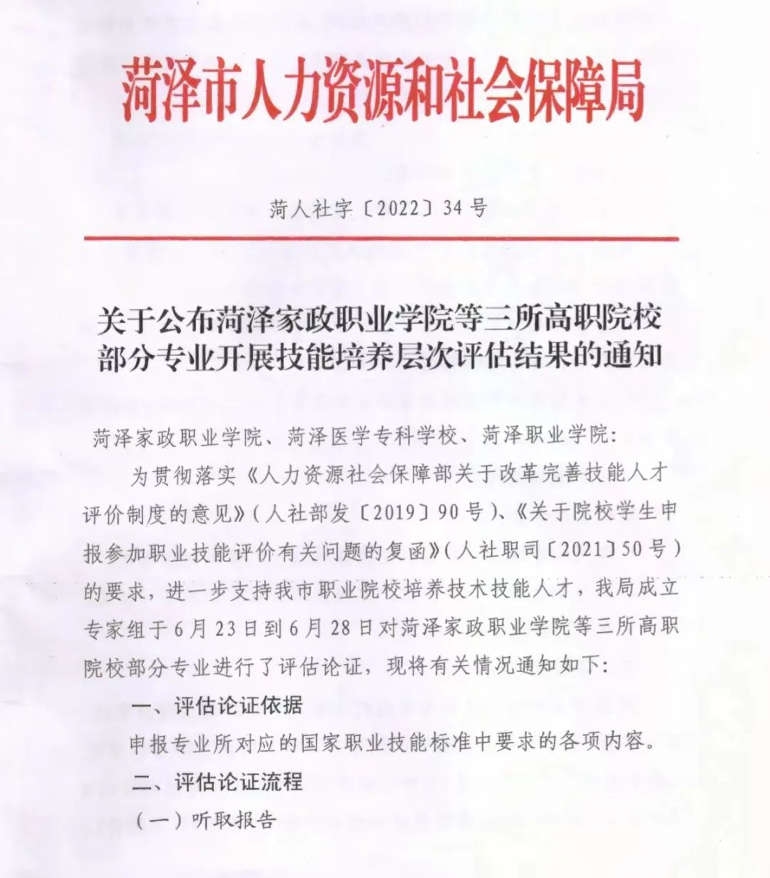 近日菏泽市人力资源和社会保障局发布了《关于公布菏泽家政职业学院等三所高职院校部分专业开展技能培养层次评估结果的通知》详细内容如下: