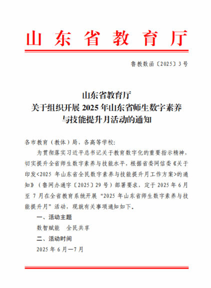 近日,山东省教育厅开展师生数字素养与技能提升月活动。此次活动以“数智赋能,全民共享”为主题,山东高等教育智慧教育平台全新上线,为教育数字化转型按下加速键。