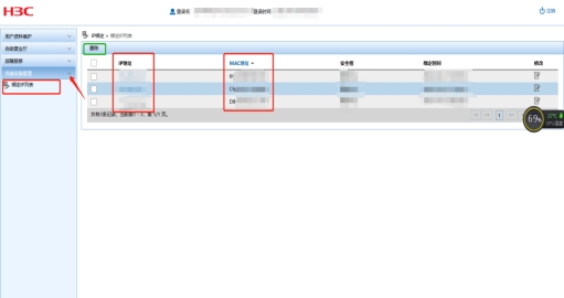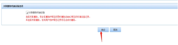 (2)在左边一列中,选择“终端设备管理”——“绑定IP列表”,根据展示的“IP地址”或“MAC地址”,选择需要删除的设备终端,点击“删除”。
