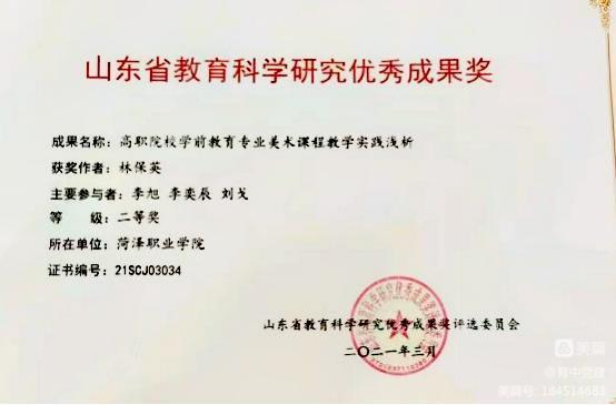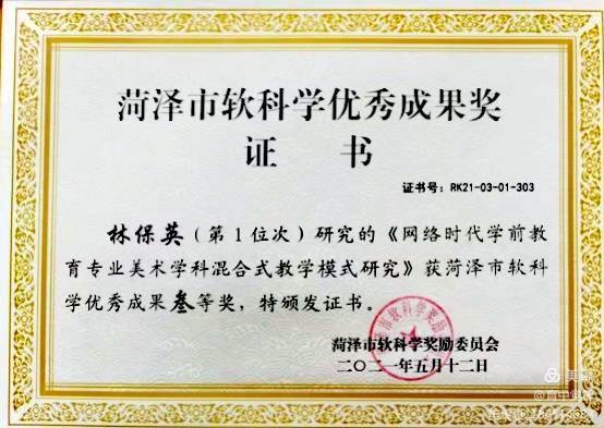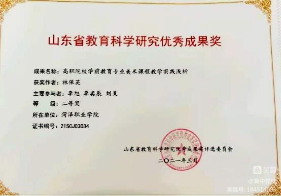 在做好教学和管理工作的同时,她积极指导学生参加省赛、市赛,并多次获得省市级奖项。在第十二届山东省大学生科技节——“赛冠杯”首届山东省大学生环境艺术创新创意设计大赛中,她指导的学生获一等奖;在第十二届“挑战杯”山东省大学生创业计划大赛中,她指导的学生获得铜奖;她指导的作品《“智”立未来——青少年人工智能教育课程体系研发》,在2021年菏泽市黄炎培职业教育创新创业大赛中荣获一等奖。在指导学生的同时,她积极参与科研工作,她主持的《高职院校学前教育专业美术课程教学实践浅析》获省级立项;她参与的《“课程思政”背景下高职院校美术教学融入思政教育的机制研究与路径探索》,已在山东省教科院立项。她参与的两项科研项目获省级优秀成果奖;她还在国家级期刊发表论文多篇。