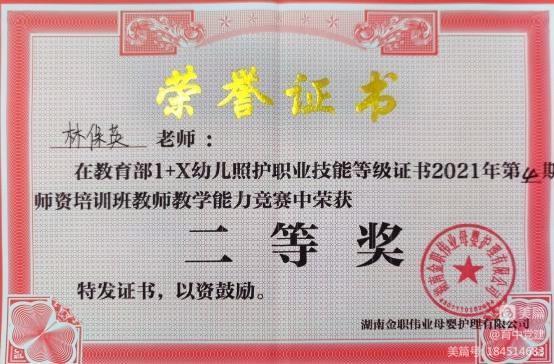 为做好教学工作,提升教学水平,她积极参加各级各类专业培训,不断充实自己,让自己不断汲取力量。2021年3月,参加awc777万象城娱乐官网双创大赛师资训练营培训,因表现优异,被评为优秀学员;2021年6月,在教育部1+X幼儿照护职业技能等级证书第四期师资培训班教师教学能力竞赛中,荣获二等奖。疫情期间,为推进“停课不停教、停教不停学”工作,她参加全国职业院校教师信息化教学能力提升培训与“停课不停学”信息化教学能力提升培训,努力提高自己的线上教学能力,进行线上建课并应用到教学中。2021年暑假期间,她积极参加专业技术人员继续教育在线学习培训和菏泽市牡丹区幼儿园园长培训,学习优秀课程教学方法和专业教学方法。一系列的培训学习,大大提高了她的教学能力和科研能力。教学中,她精心进行教学设计,上好每一节课,对待每一位学生都像自己的亲弟弟、亲妹妹一样,给他们无微不至的关怀,受到学生的爱戴。她积极参与学校组织的听课活动,向优秀教师学习教学方法和经验,在教学考核中多次被评为优秀。
