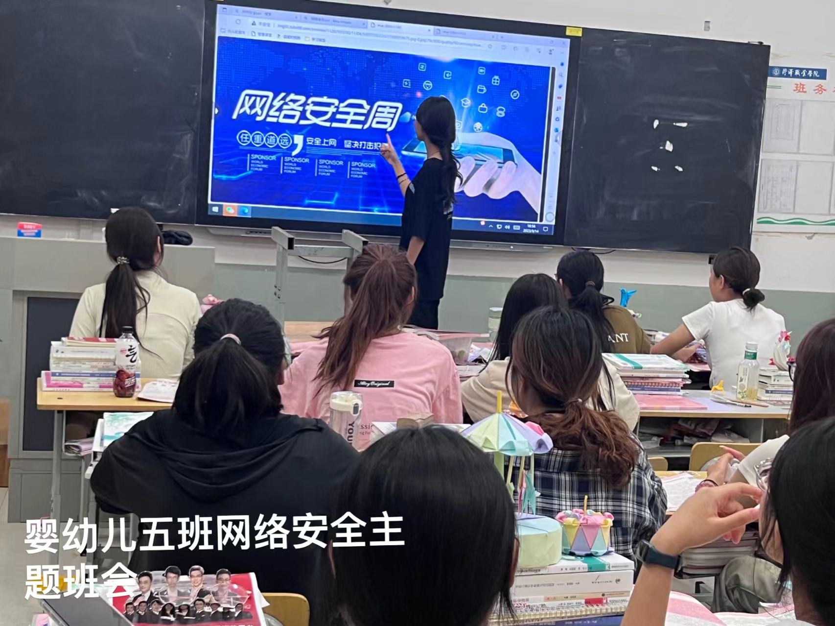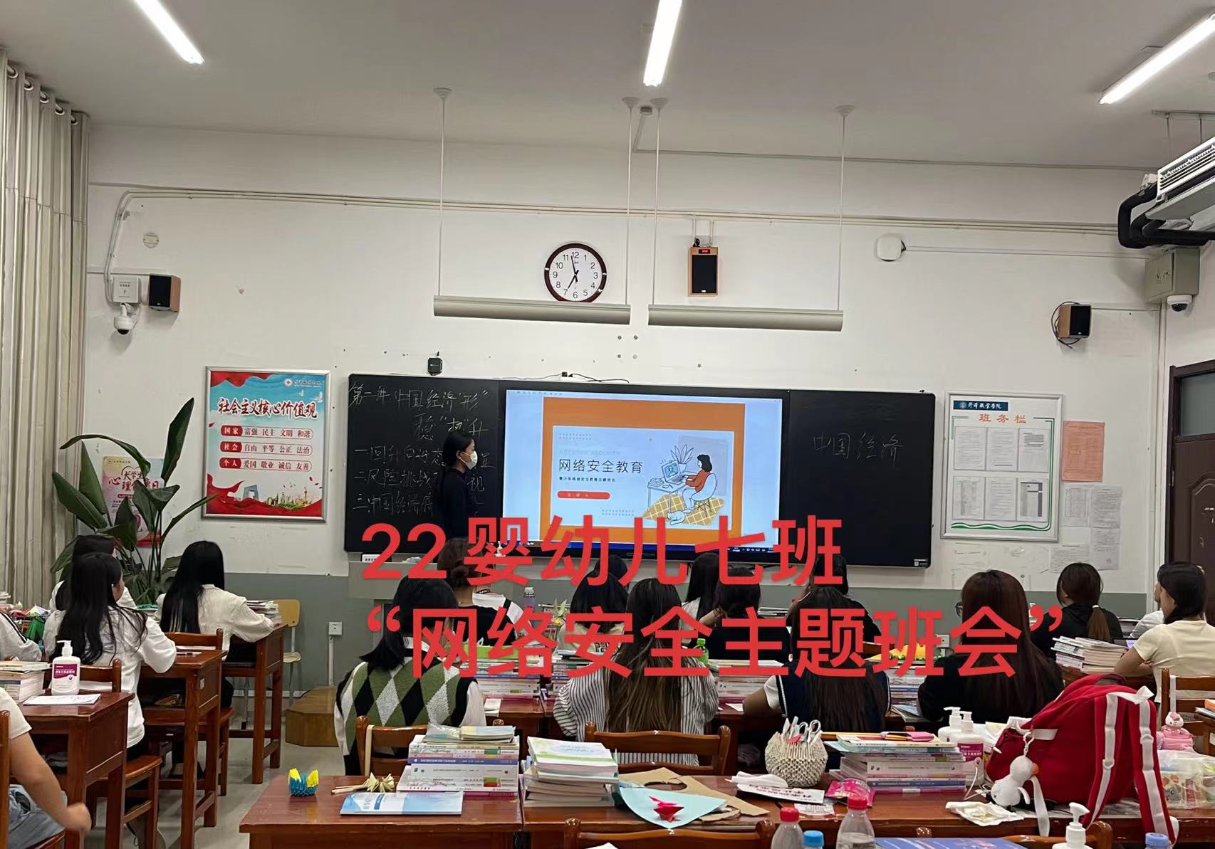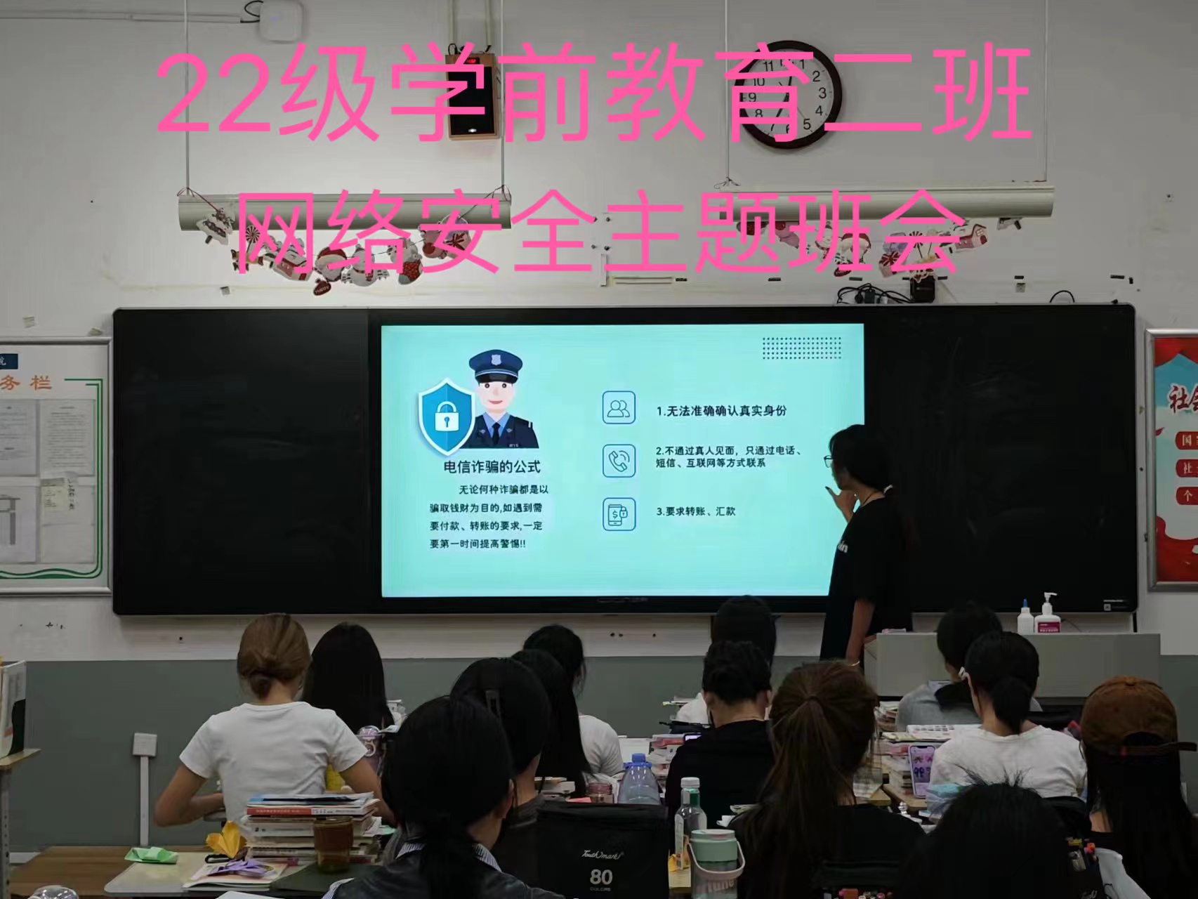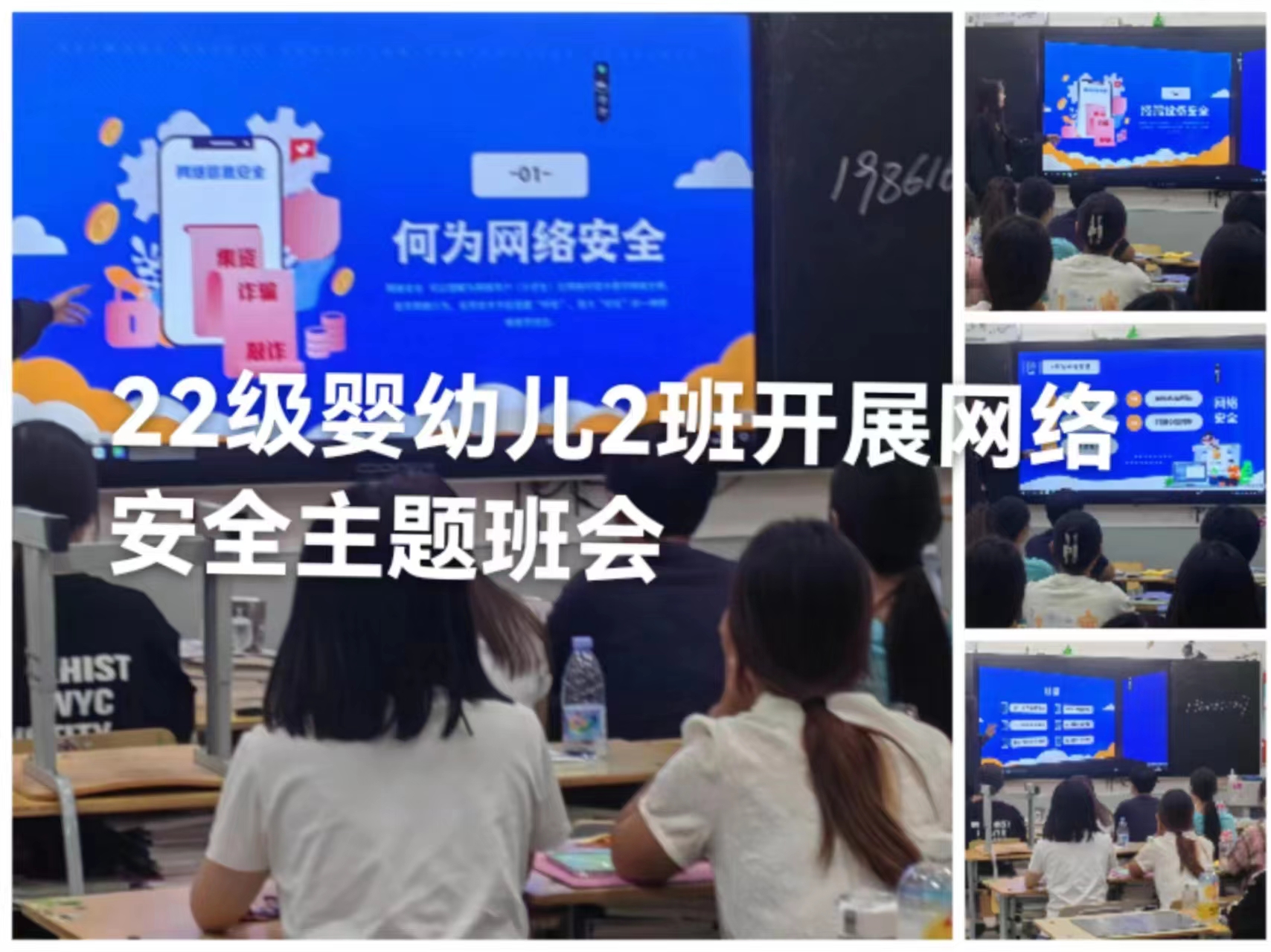 为深入学习宣传贯彻党的二十大精神、学习宣传习近平总书记关于网络强国的重要思想,宣传贯彻习近平总书记对网络安全工作“四个坚持”重要指示精神,充分报道和展现学前教育系(育中教育学院)网络安全领域工作实效,进一步坚定全体师生维护网络安全的决心和信心。在学前教育系(育中教育学院)党总支统筹领导下,学工办贯彻落实下,2023年9月14日,各班级开展了网络安全主题班会。