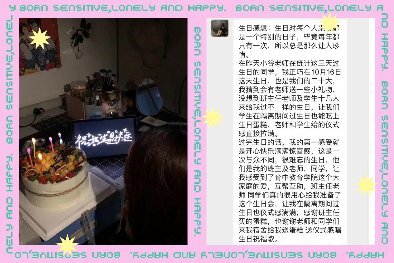 10月13日至10月16日符合返校条件的同学们已陆续返校,考虑到同学们刚刚返校,为帮助同学们尽快适应校园环境、感受学校温暖,育中教育学院党总支全面统筹安排教师党支部和学生党支部,按照《学生暖心系列活动策划》的策划安排,围绕“情暖学生 用心感受”主题,为这几天过生日的同学们送上蛋糕、送去温暖!