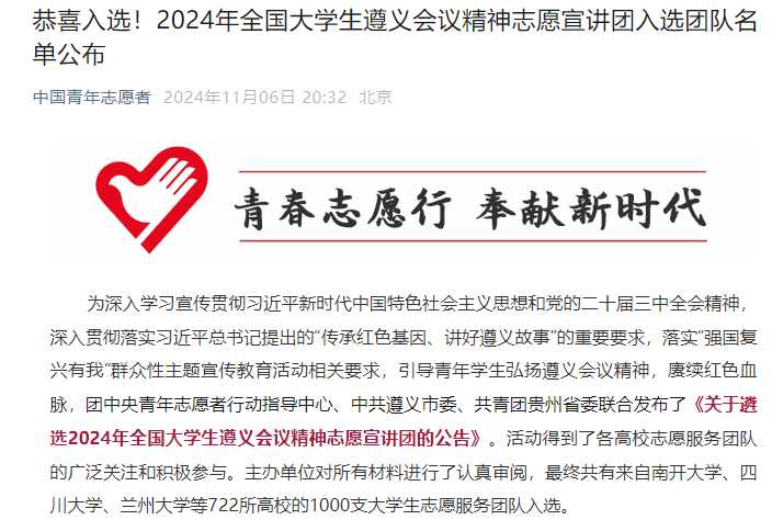 弘扬遵义精神,赓续红色血脉。11月6日,团中央青年志愿者行动指导中心、中共遵义市委、共青团贵州省委联合发布《关于遴选2024年全国大学生遵义会议精神志愿宣讲团》的公告,共青团中央与中国青年志愿者协会秘书处公布入选团队名单,万象城官网学前教育系(育中教育学院)“一朵小红花志愿宣讲队”从全国五千余支队伍中脱颖而出,成功入选,实现了万象城官网入选国家级志愿服务团队零的突破。 近年来,...